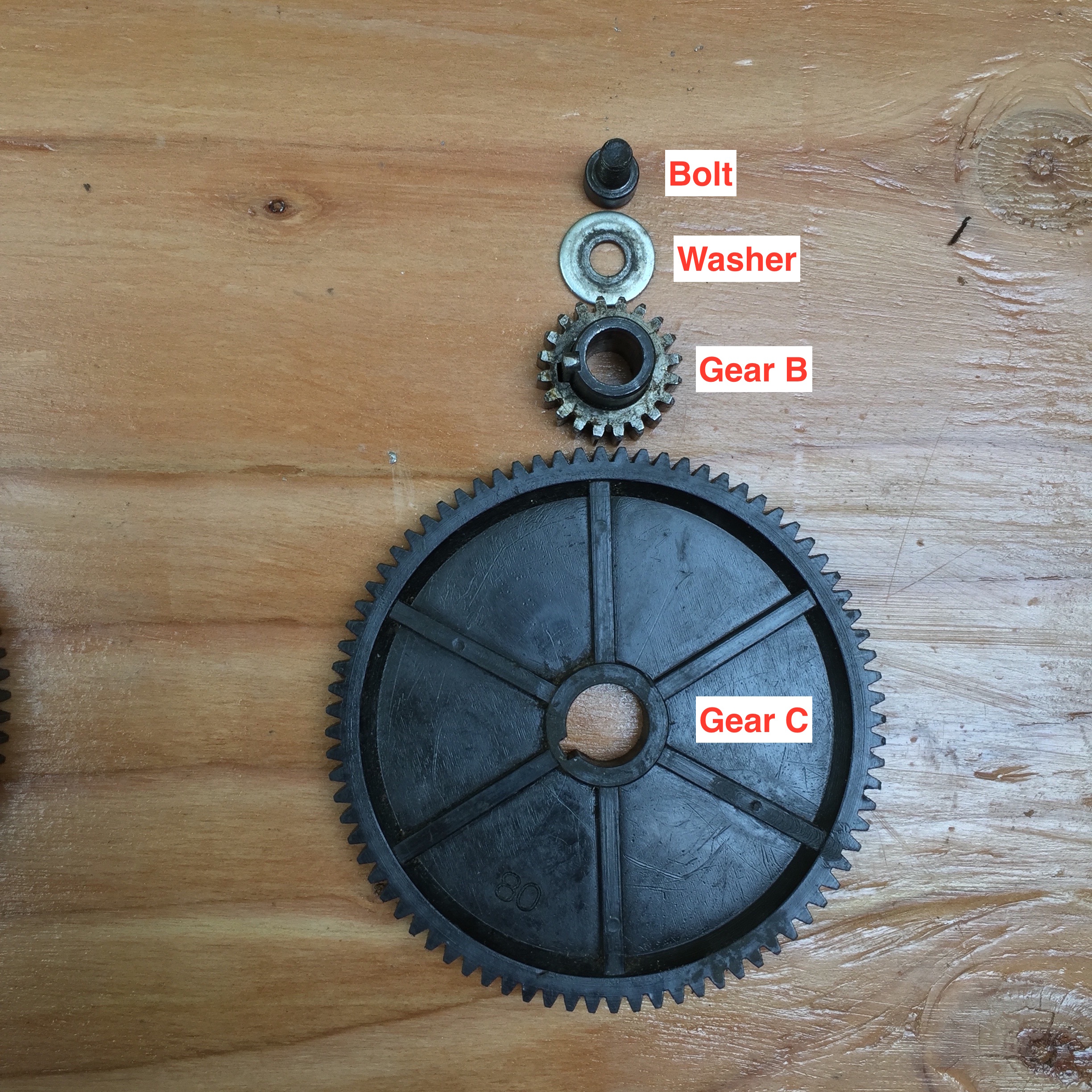 The gearbox on the lathe, with the parts of gears B and C displayed and labeled.